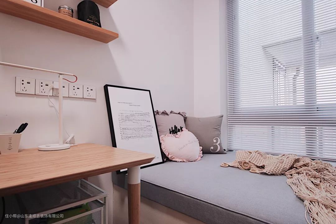 卧室旁的这个工作区,还有一个飘窗,在上方加了软垫子,可以靠在窗台边小憩一下。