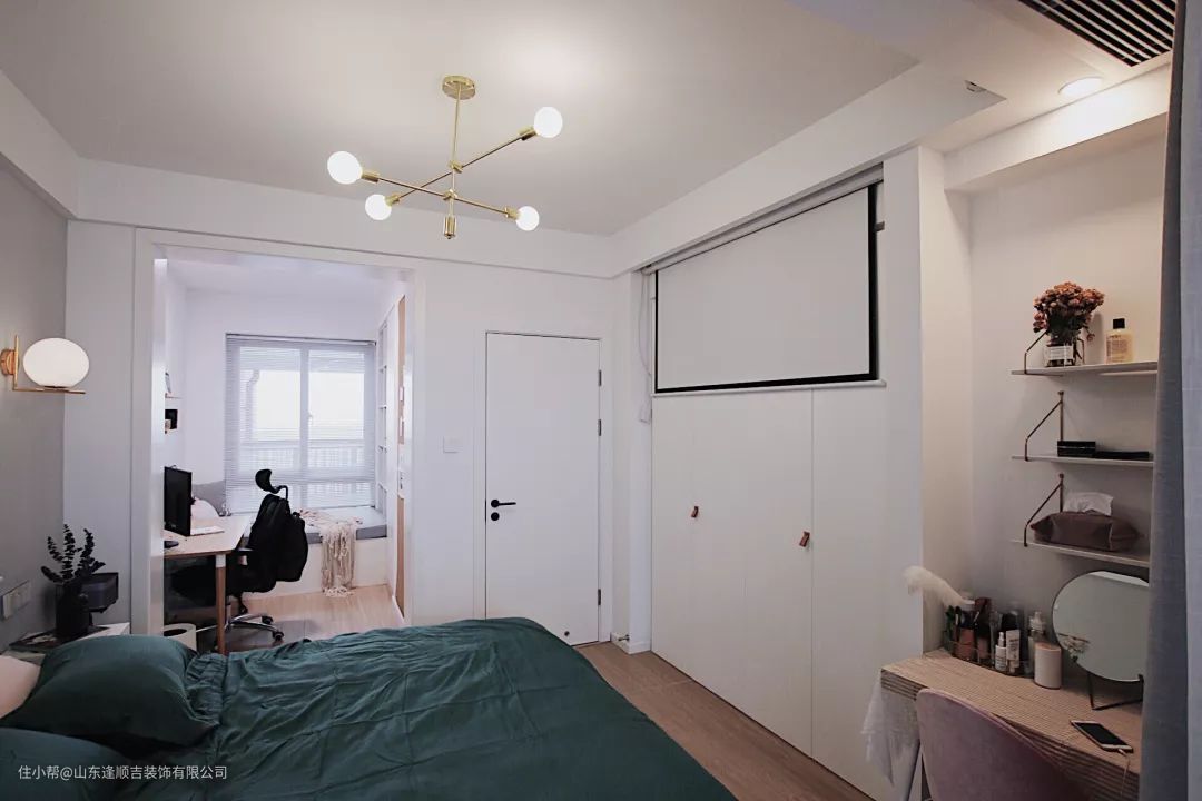 衣帽间门前的吊顶上,还隐藏了一块投影幕布,躺在床上就能看一场精彩或浪漫的电影,让生活充满了乐趣感,床头靠窗的小空间,设计成书房工作区。