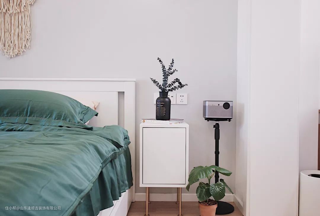 小巧的床头柜是金属架的,投影仪支架摆在一旁,再以绿植掩饰,让小角落也是和谐清新的画面。