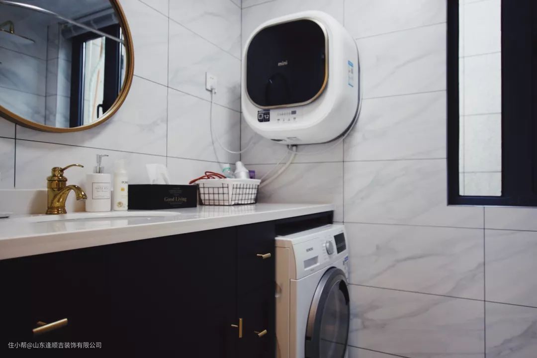 洗手盆下方的空间放置下了洗衣机,墙面还挂了一个小洗衣机,整体雅白的墙面搭配黑色洗手盆柜门,结合铜质的龙头镜框,显得典雅而端庄。