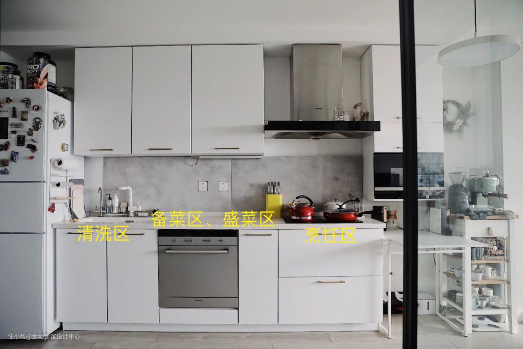 参考屋主404家的U字型厨房动线:冰箱取物-洗菜-备菜-炒菜,水槽装在冰箱与备餐台之间。