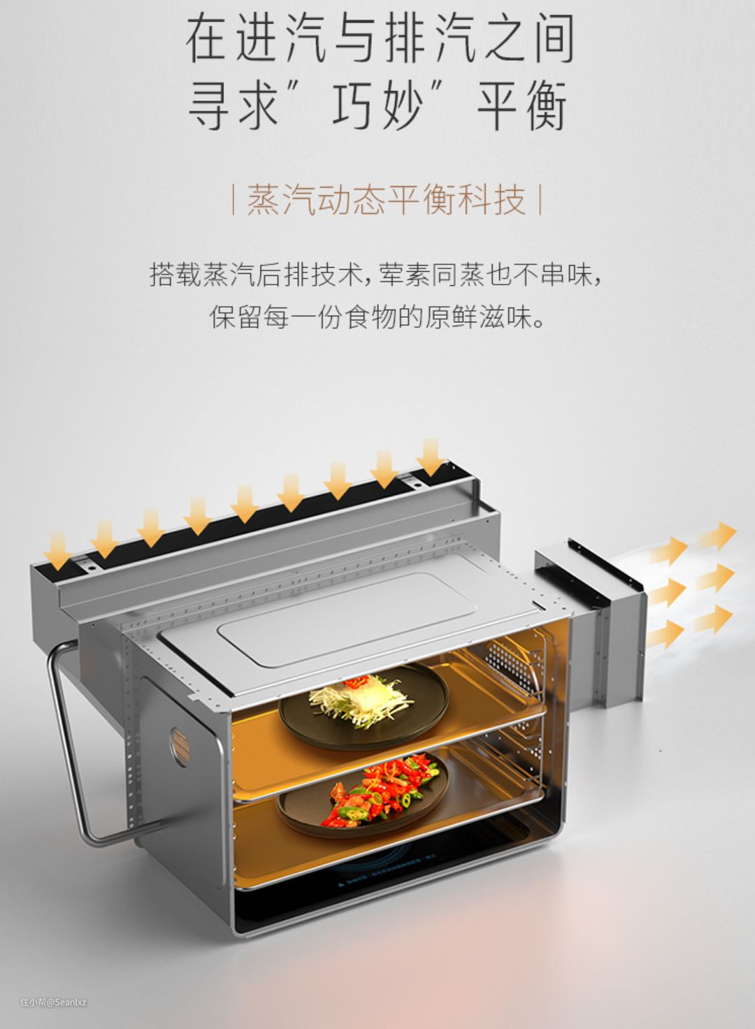 另一个是蒸汽动态平衡技术,按我的理解是可以模拟我们传统的蒸锅,蒸汽不是闷在蒸烤箱里的死循环而是会有新空气进入同时排出废气,多种食材同时蒸不会串味,也是一种高端的蒸箱技术。不过没实测,看原理是会影响温度均匀性的。