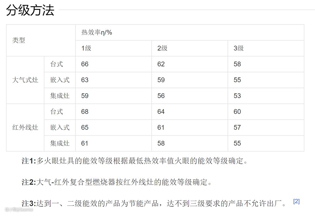 燃气灶能效标准/等级是表示家用燃气灶具能效高低差别的一种分级方法,《家用燃气灶具能效限定值及能效等级》(GB30720-2014)对各类燃气灶具的热效率都设定了能效限定值,并将家用燃气灶具能效等级分为三级,达到一、二级能效的产品为节能产品,而达不到三级要求的产品不允许出厂。