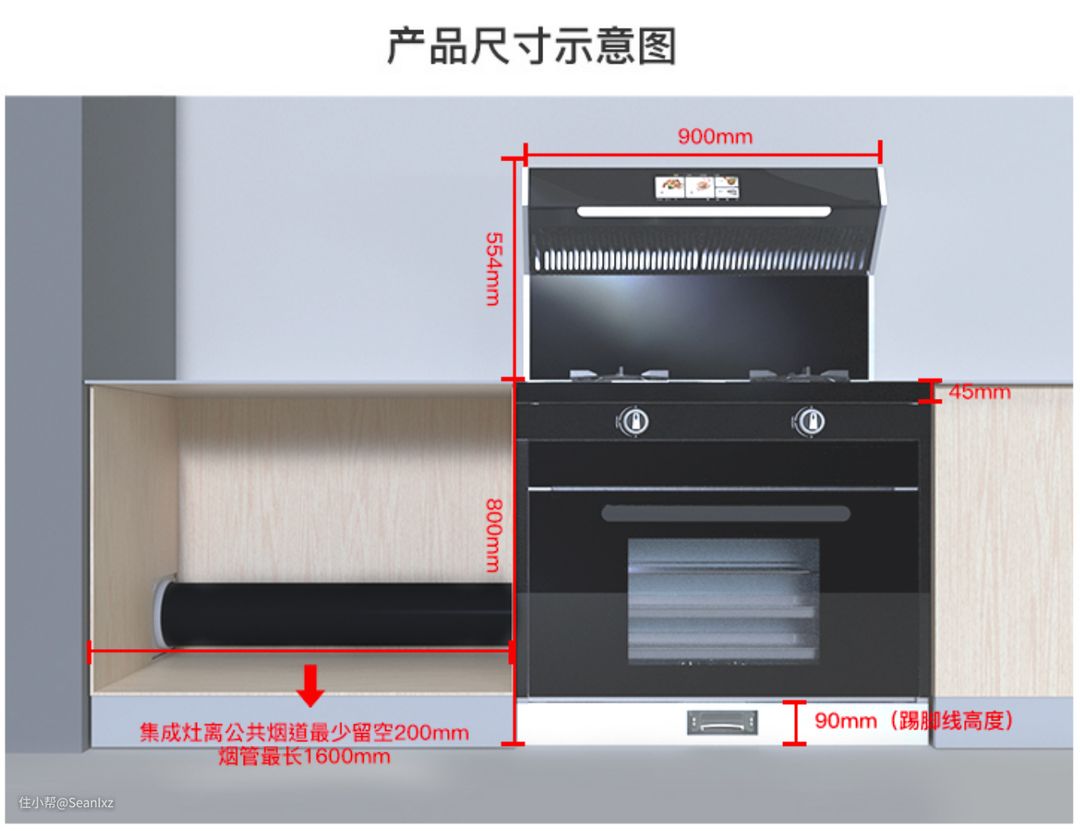 集成灶定尺寸是在选择橱柜之前,每款产品都有详细的尺寸图和安装图,需要适配橱柜。