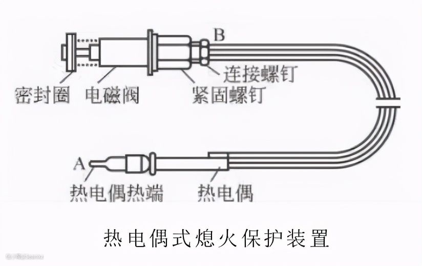 原理其实很简单,热电偶实际上是个温度传感器,它受热时会产生热电势,热电偶受热时,两种不同金属中的自由电子接受热能,运动加剧而形成热电势,这是一个热电能转换过程。把热电偶产生的电势接入电磁阀的线圈,产生磁场使电磁阀动作,气阀开启,主气道中的燃气导通,维持主燃烧器正常燃烧。一旦热电偶检测的火焰熄灭时,热电偶引出线端的电势很快下降至零,磁控阀线圈失电,在弹簧的作用下,它迅速复位,阀门垫封住气源通道,中止供气。