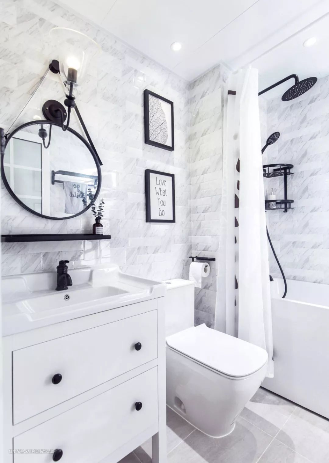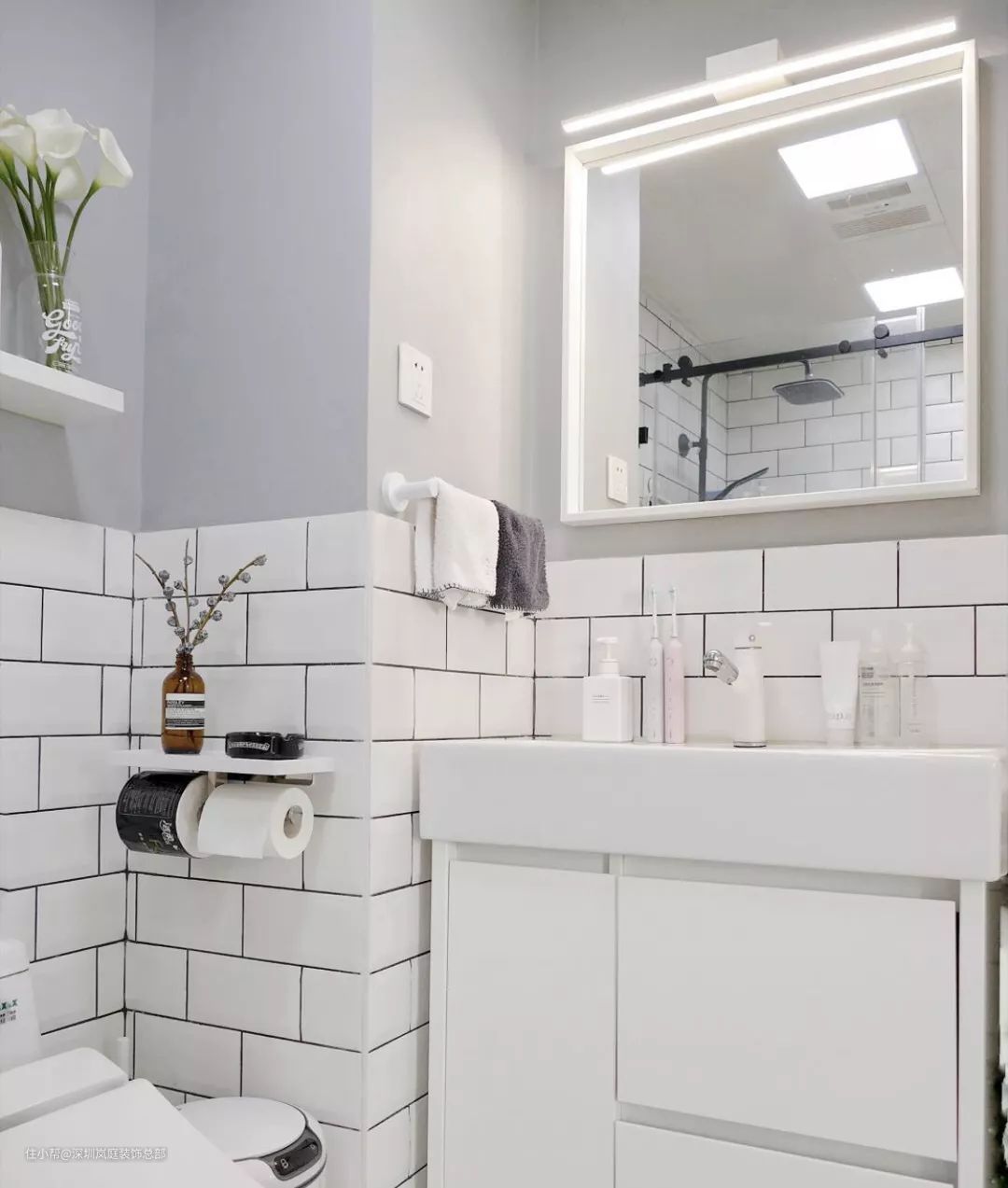 觉得单调的宝宝可以放置些妹妹喜欢的香薰或者妈妈喜欢的绿植,可以把在你收藏夹待了N年的有设计感的水龙头、毛巾架、浴帘甚至是没什么用但是