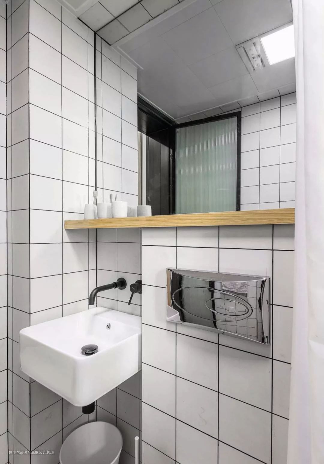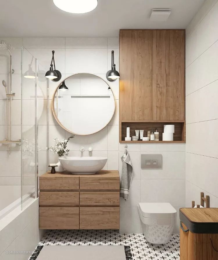 小卫生间最好用简单清爽的黑白灰、原木色、淡色,才不会显得压抑。花俏的色彩或者设计都会让原本就小的空间在视觉上显得更加拥挤。