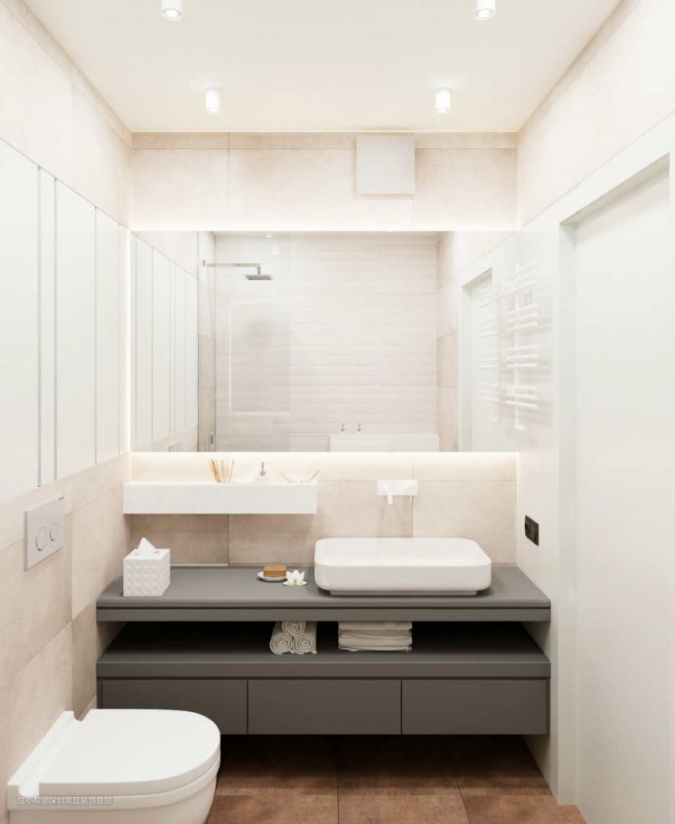 现在越来越多家庭会考虑壁挂式的马桶,如果做壁挂式马桶的话,不妨将水箱的位置和浴室柜一起定制一体化的柜子,上方做一个方便置物方便臭美的大镜柜,视觉上也更加统一。
