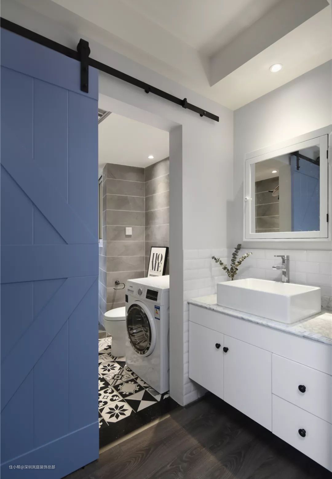 如果洗衣机还想放在小卫生间,不如做成二分离。从公共区域借一点空间,将洗漱台外移。洗漱蹲坑互不影响,全家效率更大化,卫生间里面也不用太过拥挤。