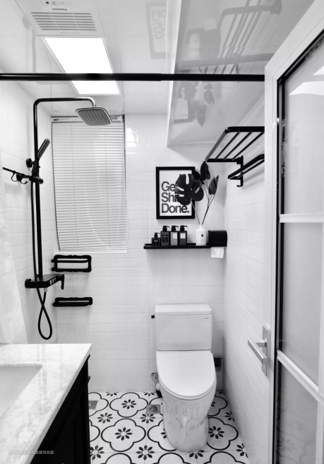 还是介绍最常见的布局,进门依次是洗漱区、如厕区、淋浴区。淋浴区用移门玻璃隔断。