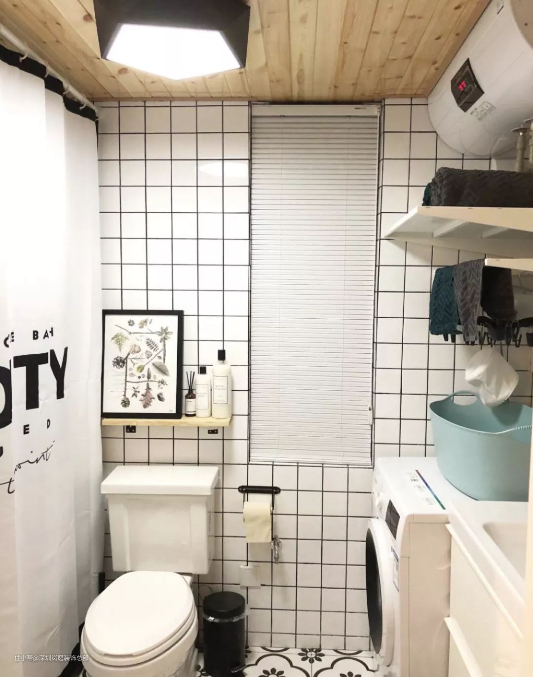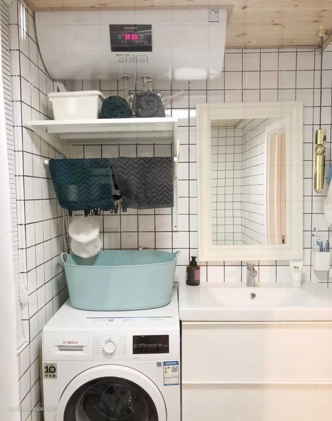 利用浴室柜旁边的位置放洗衣机,墙壁装置物架,打造成洗衣区,热水器放在洗衣机上方,充分利用垂直空间。