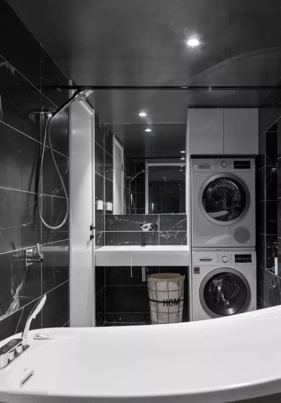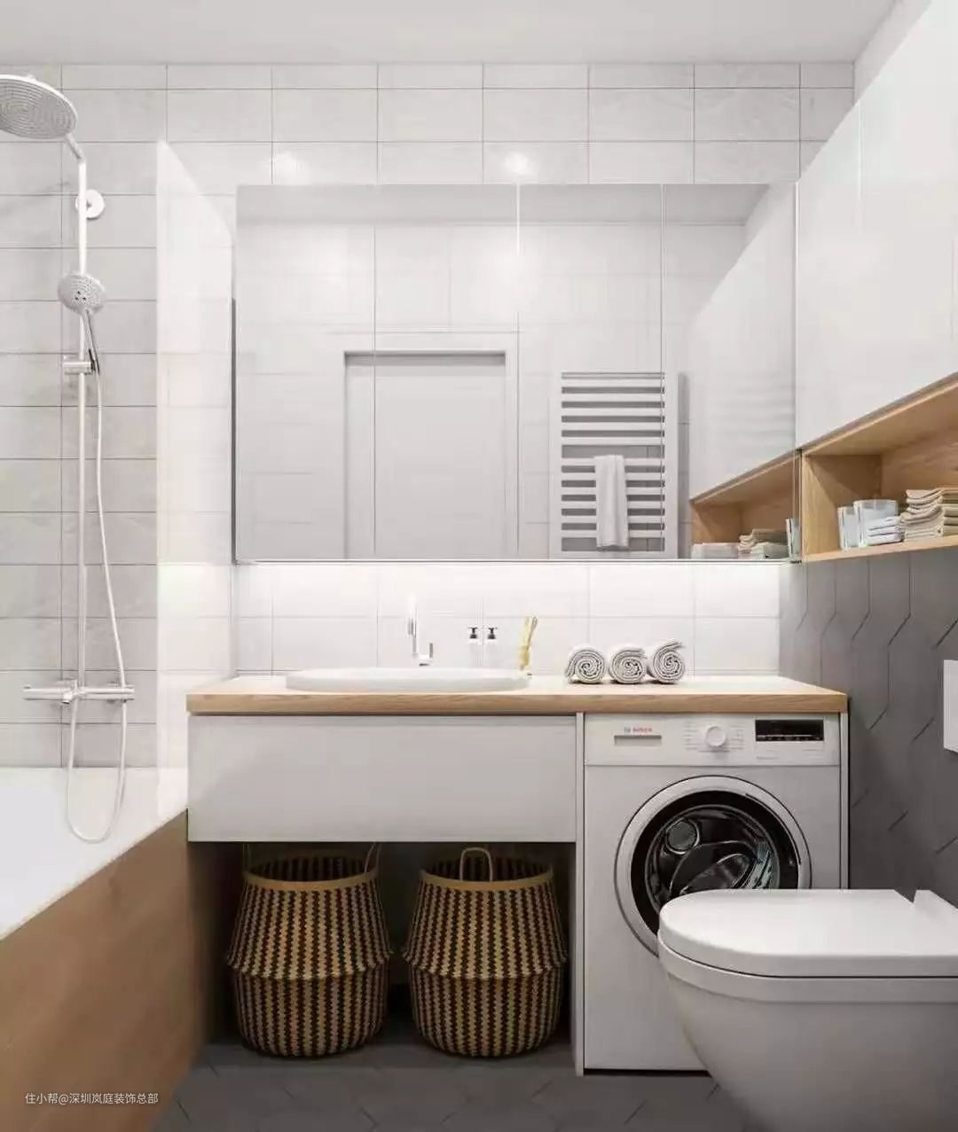 垂直空间充分利用,洗衣机、烘干机、壁挂洗衣机、浴缸通通放得下~