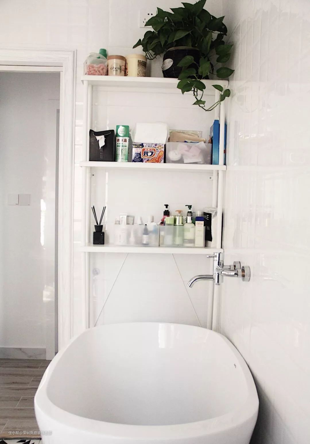 浴缸上方也是设置收纳架的不二选择~拿沐浴露特别顺手啊!除了需要用到的洗发水洗面奶可以随手可得,增加气氛的香薰绿植也可以放上去哦~