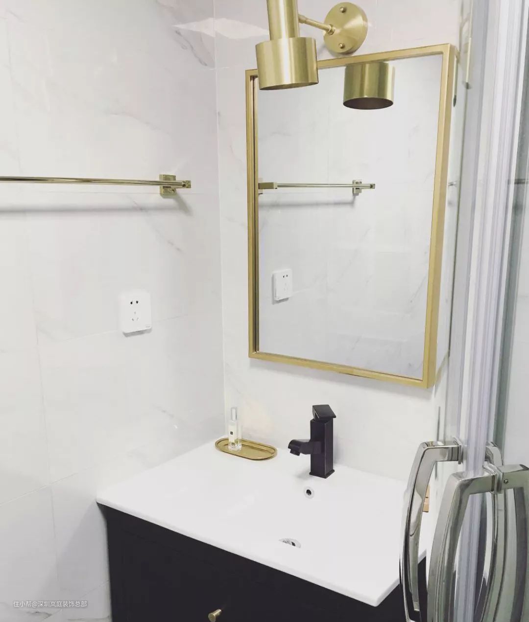 另一边则作为沐浴区用来放浴缸和淋浴房。这里小精灵要给大家安利一个神设计:把淋浴房的玻璃门做成了向内关闭的折叠式,平时使用时可向外推出形成方形空间,不使用时则向内关闭空出更多卫生间的空间。既实现了对卫生间的所有需求,又不会显得那么拥挤。