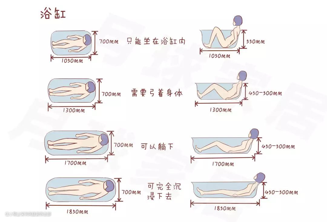 最后,为了保证同学们卫生间质量有保证,小精灵还特意整理了一下卫生间各种洁具的最小尺寸,和各个功能区保证使用舒适的要预留的最小空间供大家参考哦~