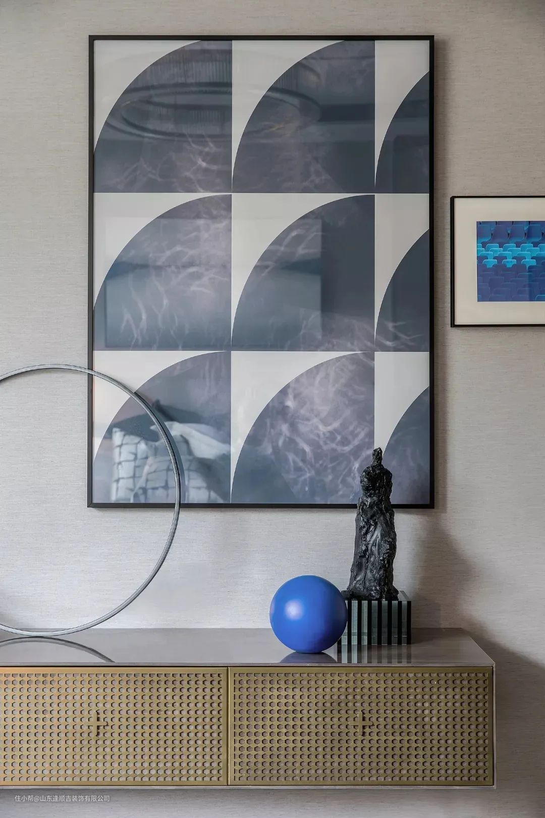 ▲黑灰色花纹凳子,布置蓝色布艺,也增添了空间的安静与神秘气质。电视墙以定制地台+硬包为背景设计,边框加入金属材质,华丽现代的质感,显得更加时尚高端。