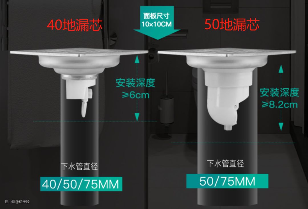 移位后的地漏选择,需注意如上的水管直径及安装深度