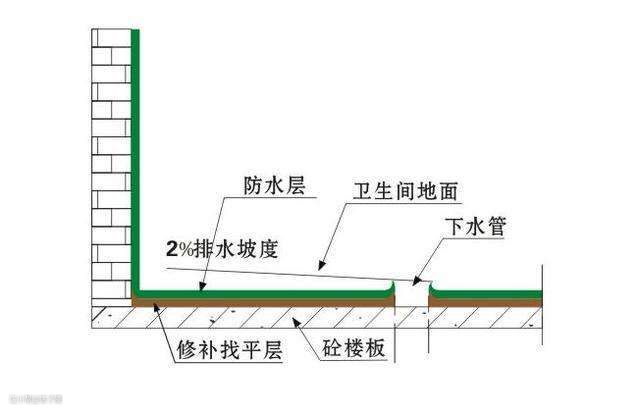 国家标准:卫生间的地面标高设计应比室内低20~50mm。地面向地漏处排水坡度一航为2%~3%。卫生间回填、找平时,应以地漏为中心向四面方向辐射,找准坡度,用刮尺刮平,抹面要求平整,表面无坑、无缝隙,不起沙,以不积水为准。