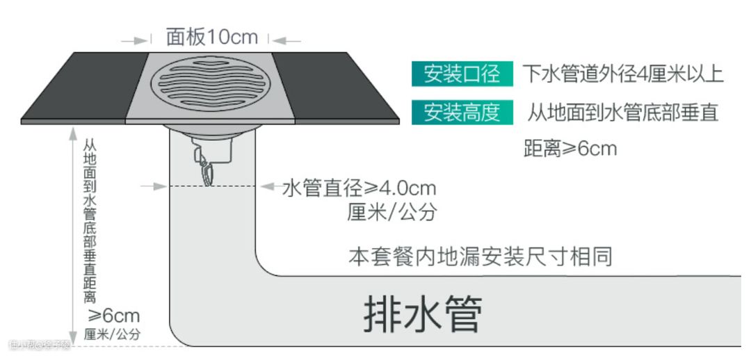 一般地漏安装高度从60mm~150mm,购买前要测量下安装高度,避免买到安装高度过高的产品,导致装不了,安装高度测量方法如下。