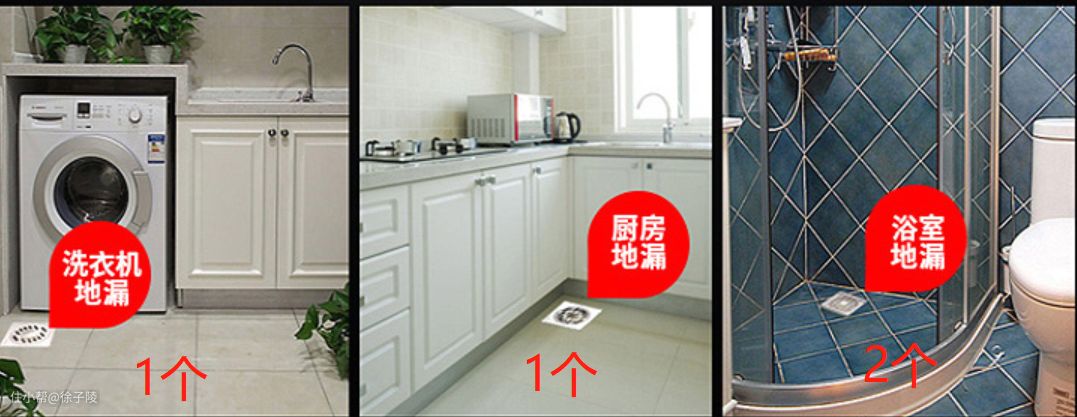 1、卫生间:有干湿分离,干区1个地漏,淋浴区1个地漏,共2个地漏;如没有干湿分离,可1个地漏2、厨房:需要1个地漏,防止角阀、龙头、或者水管破裂,没有地漏排水造成水漫金山3、阳台:有洗衣机,需1个洗衣机地漏(可地面排水和洗衣机排水)