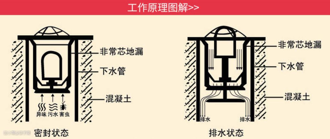 注意:直通式密闭式地漏就是:有水流通过时,地漏底部的密封垫会自动打开,直通式排水,排水完毕后,密封垫靠内部装置自动闭合,形成全密封!