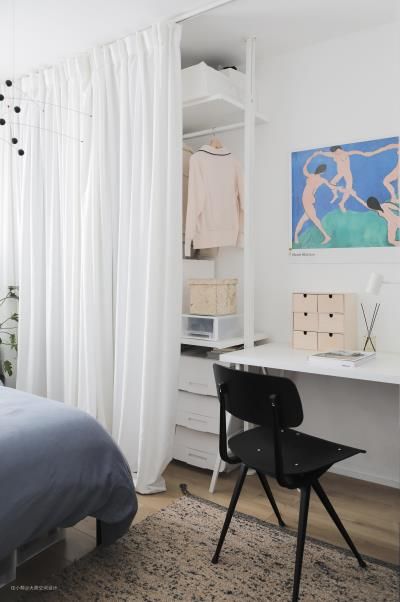 没有用常规的衣柜,而是用定制了拉帘做了柜门,布帘的材质也会让空间变的更柔和温暖 床头的装饰画是我非常喜欢的艺术家JORGEN HANSSON的作品,只是简单的线条,但我就很喜欢简单的设计 装饰画:live art