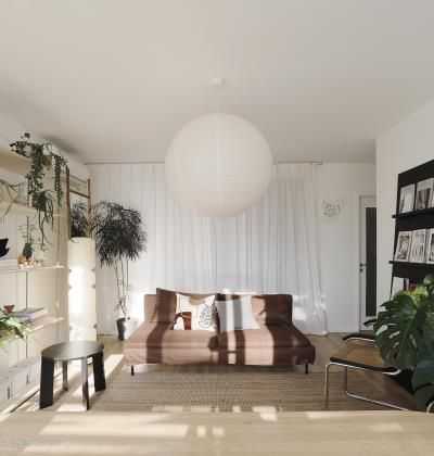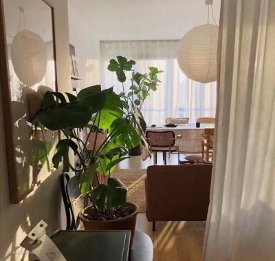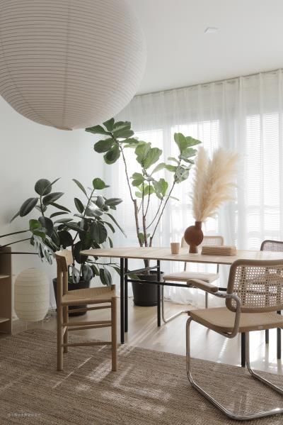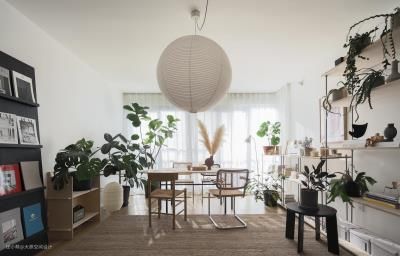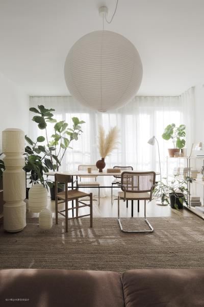拂帘而入,你会看到—盏巨大的球形纸灯,像是悬挂在空中的一颗月亮,温柔地迎接你,随之而来的就是远远近近掩映在空间里的绿植。客厅没有做遮光帘,用了纱帘和百叶来调节光线,有充足的自然光的状态也是我一直追求的 吊灯:HAY