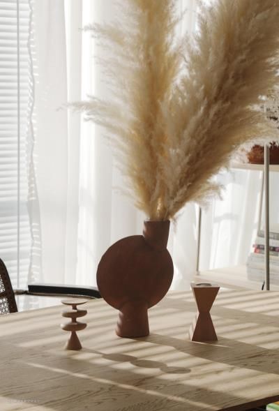 充满光影的日常,来自Conceo101 的红色花瓶陶土质感的花瓶搭配芦苇,很有秋天的感觉