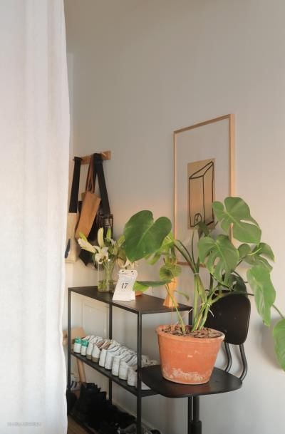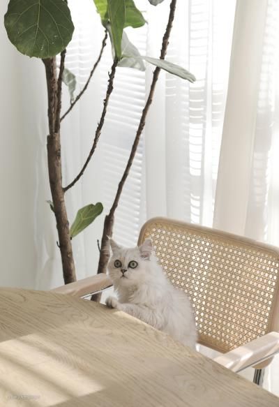 鞋架的另一边放了一个吧台椅,上面放了一盆龟背竹,希望一回家就能感觉到自然 白色的窗帘既避免了一眼看穿空间的尴尬,也柔和的划分了玄关和客厅的区域,若隐若现的光影与客厅,就像为家增添了滤镜般。