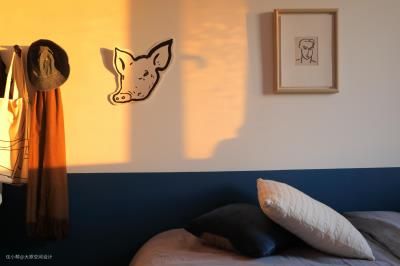 次卧衣架是宜家买的天地撑,提前用层板分好高度,再用各种规格的盒子进行不同需求的收纳。海报上的蓝色和床品以及墙裙的蓝色做呼应,最后在床尾放了一张蓝色点缀的手工地毯,迎合温馨舒适的氛围 地毯书桌衣架:衣架 椅子:HAY