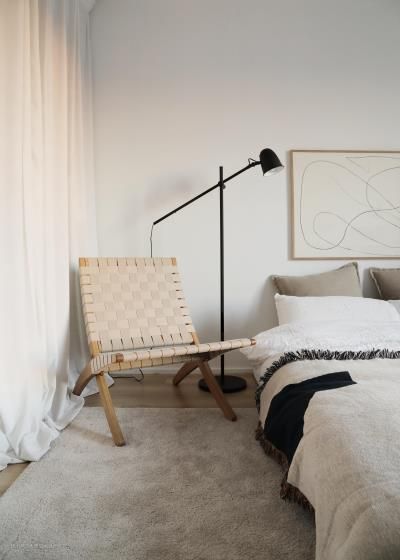 床头放了一个折叠椅,睡前可以坐着上面看会书。其实这把椅子很少坐,但是它太好看了还是选择把它放在床头,即使不坐当个摆件也是很好的 椅子:Carl Hansen MG501