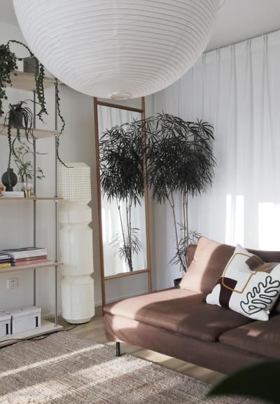 觉得索德汉沙发之前的颜色会比较单调,所以单独在淘宝定制了棕色的沙发布料套上去,让空间看起来更温馨,沙发后整面的帘子遮挡住了玄关,保证了隐私同时也是一面材质很温柔的沙发背景墙