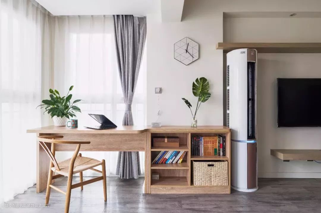 同样的我们可以做成嵌入式的办公桌和书架,这样不仅省空间,而且整体性较强,看起来比较简洁、安静,让客厅与阳台两个空间相辅相成。
