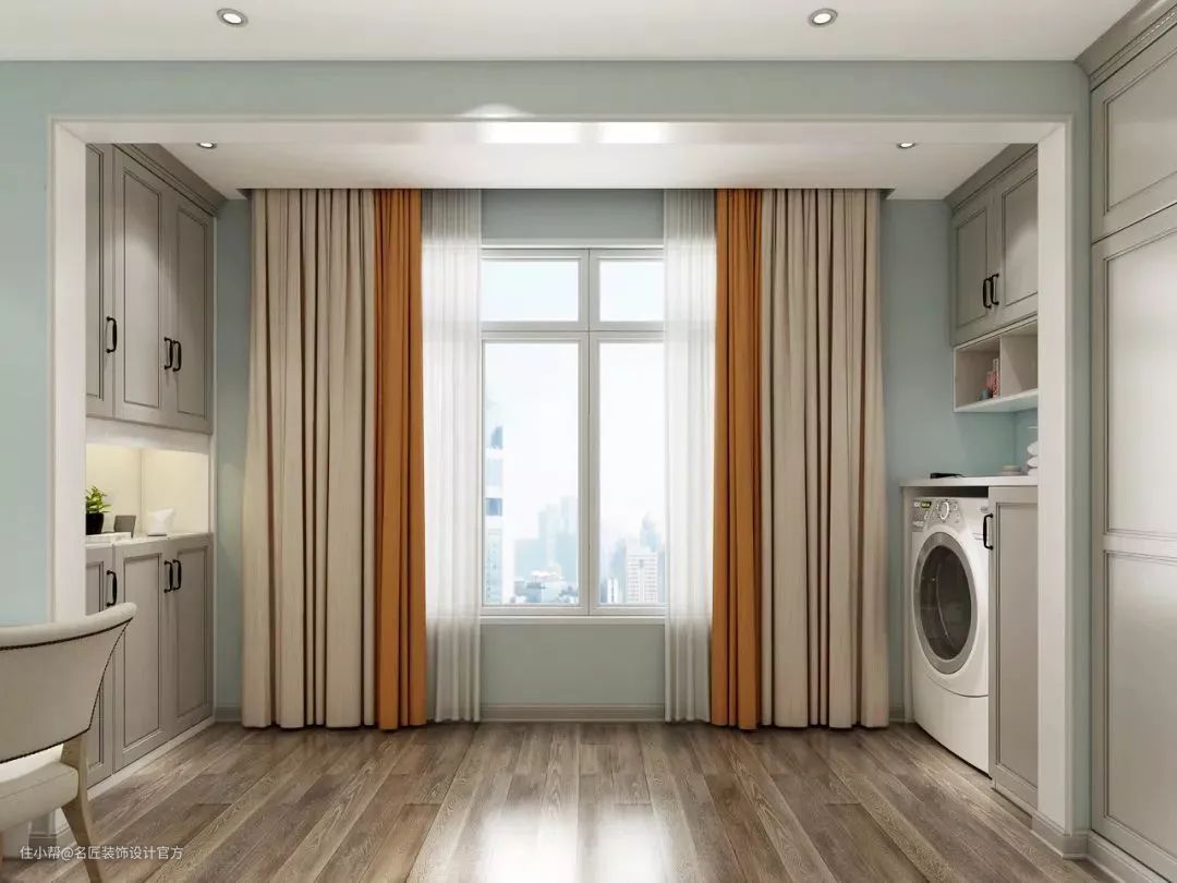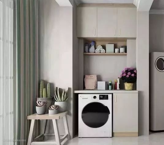 因为不用做晾衣空间,所以大部分都是和洗衣机、烘干机等家电一体化设计,也可以设置洗手池和隔板收纳,满足日常的小清洁。