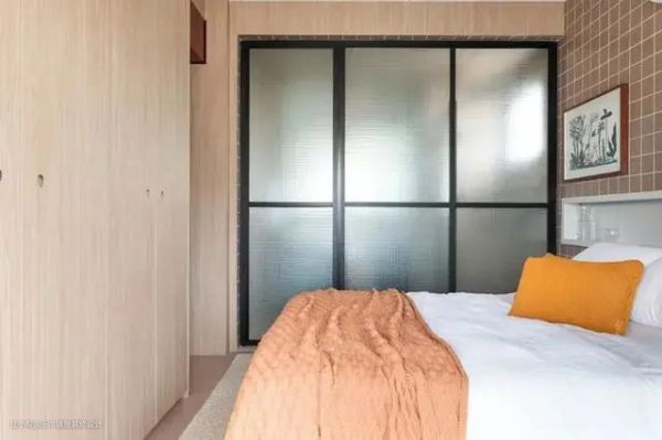卧室的床尾做了一整面墙的大衣柜,床一侧是玻璃门,门后就是卫生间,玻璃门既划分空间又透光,很不错呦。