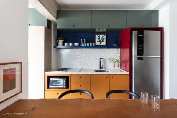 厨房,厨房的空间也不大,简单的一字型布局,冰箱也嵌入橱柜里,厨房里橱柜的配色也很特别,黄色的地轨,绿色的吊柜,蓝色的隔板,层次感丰富,满足基本需求。