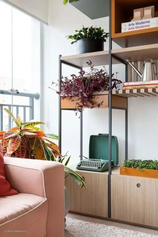客厅一侧的墙上做了一排的柜子,有封闭式的有开放式的,不管是收纳还是摆放装饰品都可以,超级实用,绿植的加入让客厅看起来更是活力满满。