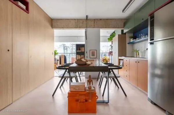 然后来看餐厨空间,餐厅里选择了长方形的木质餐桌,搭配超简约的座椅,还有餐桌一侧的箱包,打造一个简约又有格调的餐厅