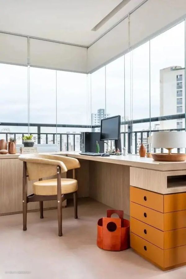 最后来看看客厅里的阳台吧,阳台上光线充足,直接把阳台打造成了书房,拐角也被充分利用起来,在这办公累了还可以看看室外放松一下。