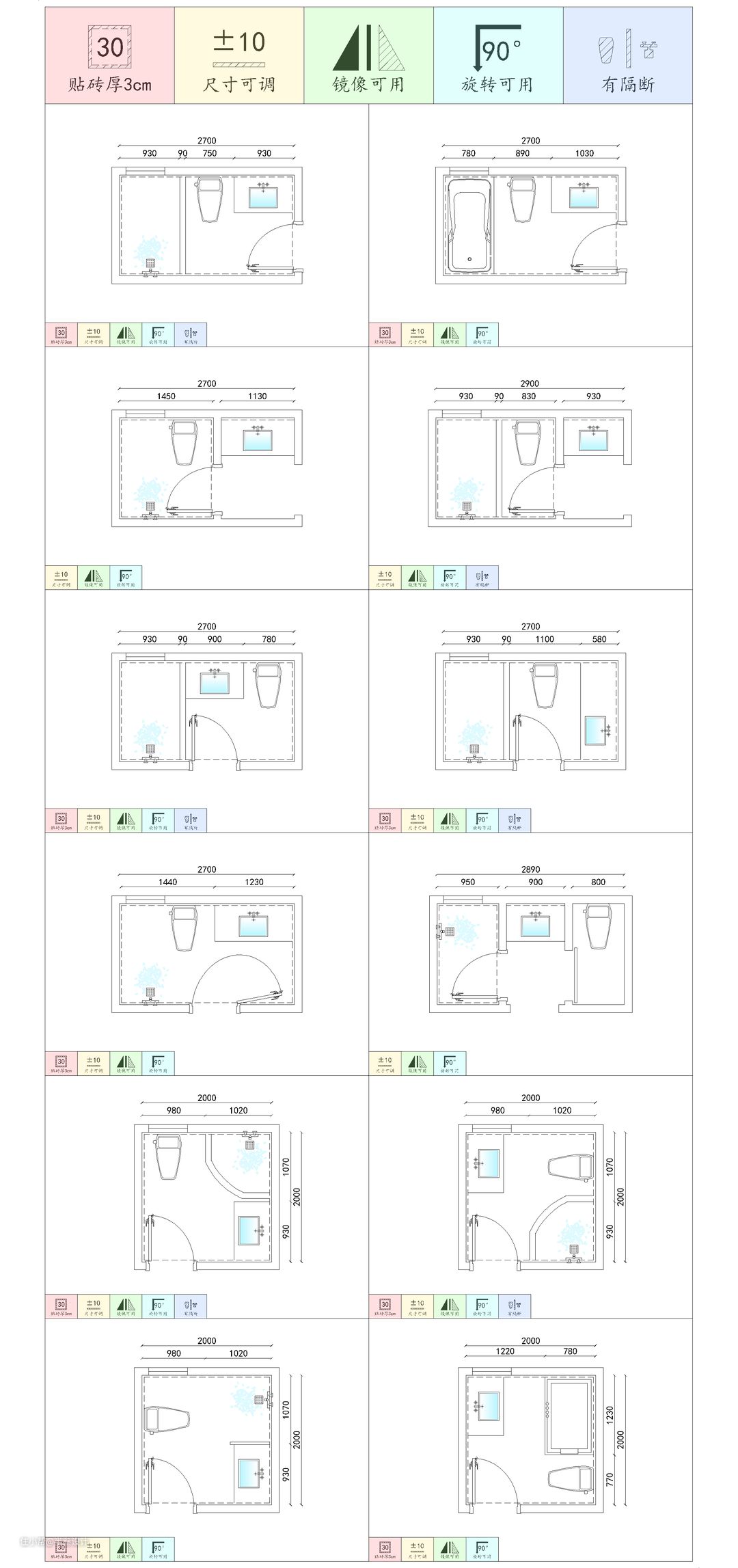 图例中卫生间净空参考尺寸为2700*1560,2900*1560和2000*2000