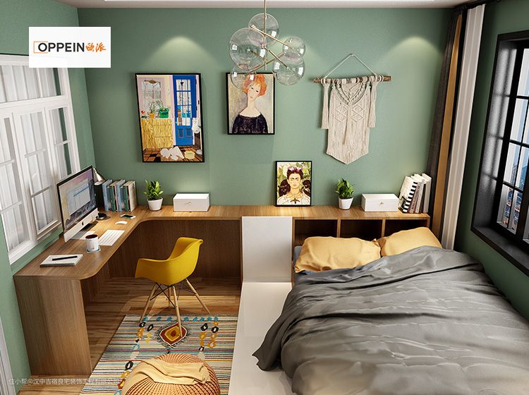 经过改造,设计师打破原有布局,将原本的睡眠区打造成兼顾休息和学习的多功能房,极大的提高空间利用率。靠墙定制床头衣柜+小书桌,集学习、休息与储物于一体,非常实用。