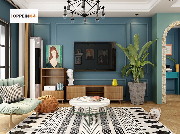 电视柜如果只注重收纳空间,往往会丢失美感,因此设计师专门定制两款地柜,组成一个“L”型。左侧放置一个小型的立柜既可用作展示柜,也可用于收纳。