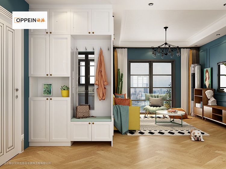 入户柜设置在进门处左手边的位置,与之前入户的杂乱相比,鞋子可以妥善摆放,让房主人一进门就能找到家的感觉,既温馨舒适又容易打理。