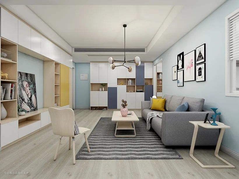 “墙浅地中家具深”、“墙中地深家具浅”就是利用色彩的上升感和下坠感,把颜色重心放在地面,通过空间上的反差,可以让整体更加简约清新。面积小,层高低的户型运用这种装修风格,会让空间显得更大更敞亮。