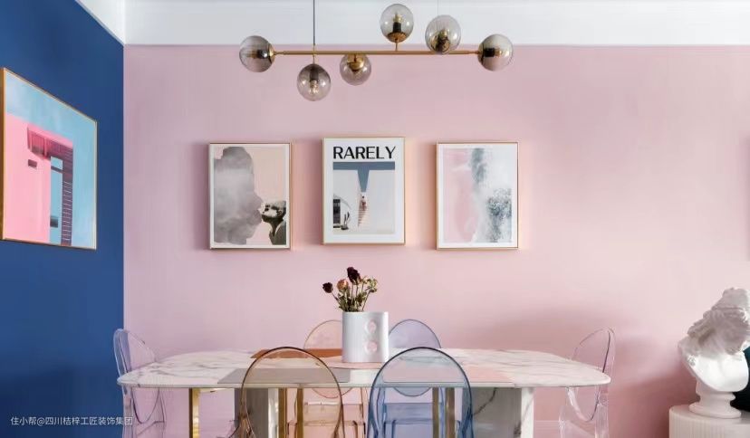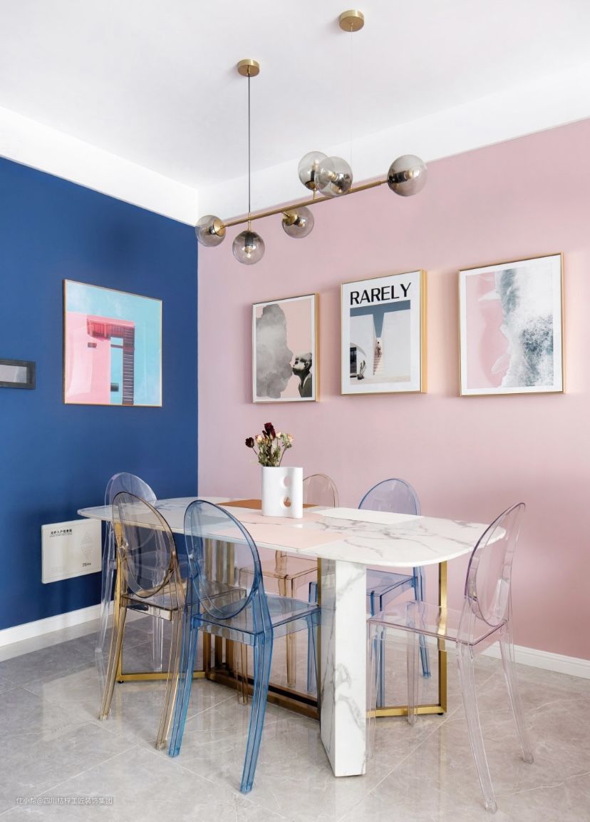 #餐厅 #蓝色 #粉色 #大理石餐桌 #亚克力 #金属 #玻璃灯