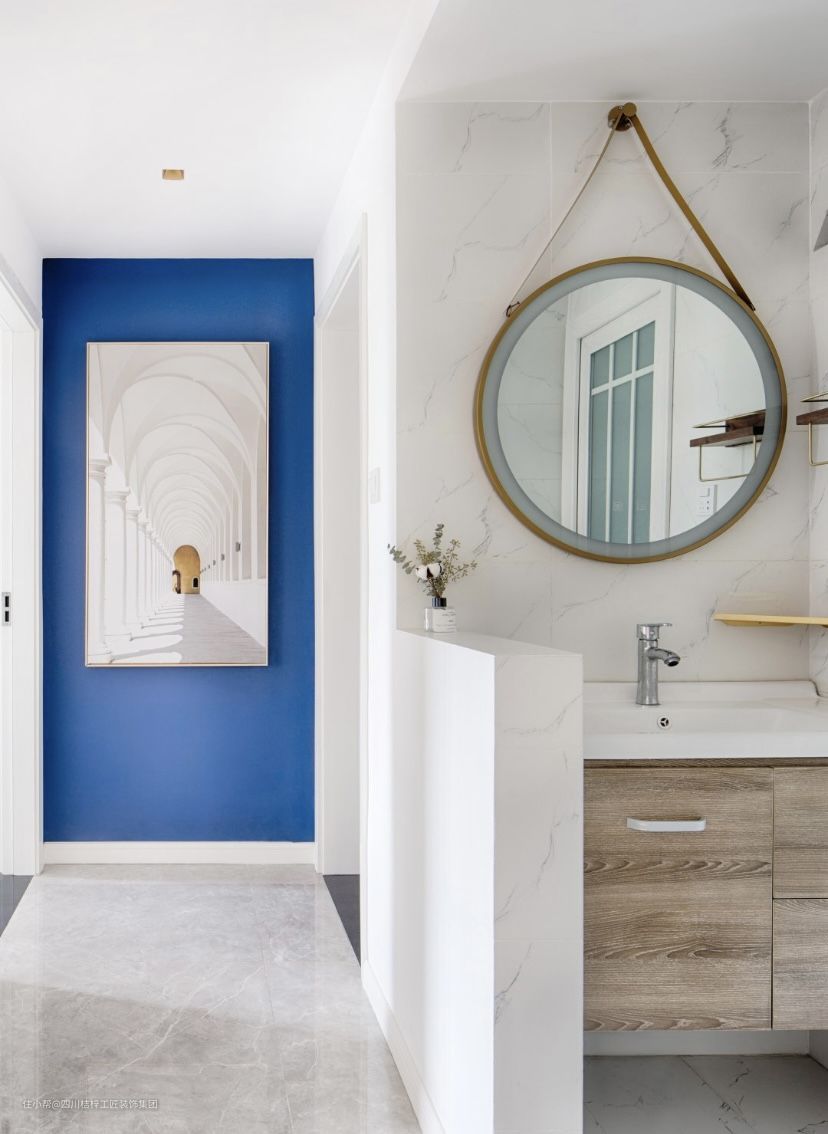 过道尽头的蓝色墙面和客厅背景墙呼应,两侧的白墙视觉上扩宽了走廊空间,面与面之间错落的色彩差异,展现了空间的立体感。 #过道 #走廊 #挂画
