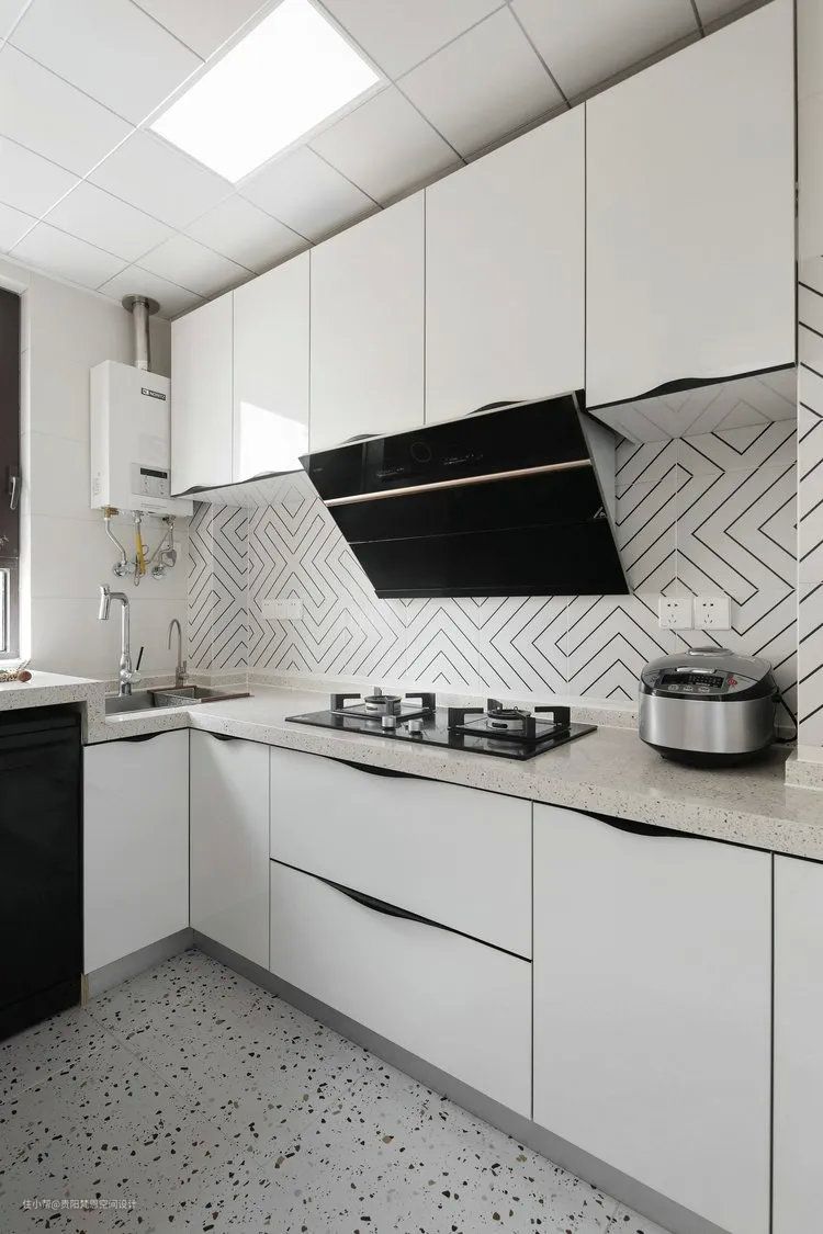 厨房干净整洁,功能应有尽有,设计和搭配也是非常漂亮,地面和墙面的瓷砖都是采用了仿古砖,耐看又有韵味,无把手设计的纯白柜门,搭配几何图案瓷砖、水磨石地面,打造了一个既时尚又有人间烟火的地方,干净利落的线条,视觉扩张力极强,处处都是精美格调。