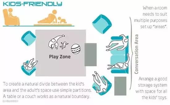 如果平时成人需要在家办公,或家中有小孩需要玩乐区,可以在客厅正中央划分出功能区,可以用沙发或茶几将功能区和休息区隔开。