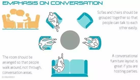如果家中多人会谈和多人聚会频繁,则可以将茶几摆在客厅正中央,沙发和座椅都围绕茶几形成一个圆圈或者一段圆弧,这既便于交谈又充分利用空间,又因为各个家具的间隙不小且相连形成通路,视觉上给人一种客厅很大的感觉。