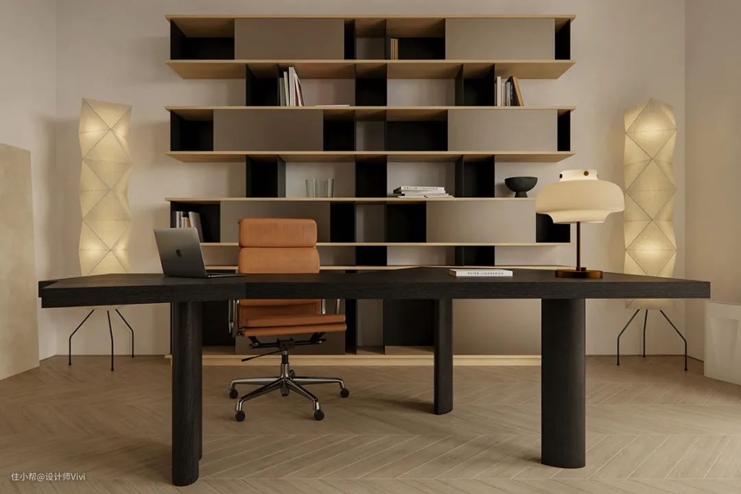 卧室内还设置了一个小型办公区,黑色书和橘色真皮沙发非常搭,书架与落地灯,对称中又带有些许的差异,呈现到人们面前的是优雅的设计美学。